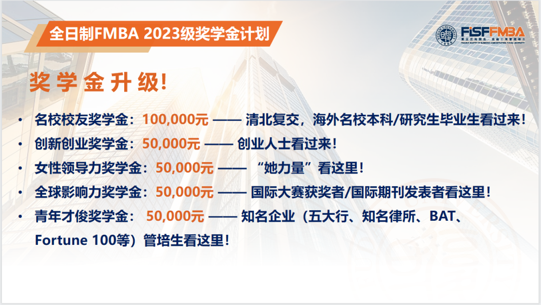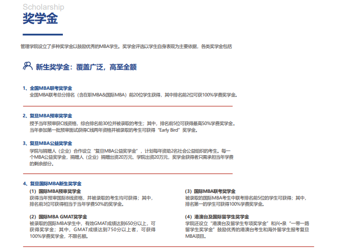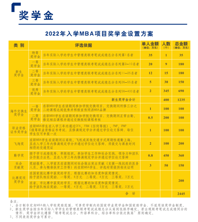 2022级全日制MBA新生奖学金最高可获全额奖学金36.8万,相当于100%学费!在职MBA最高可获10.5万特等奖学金。