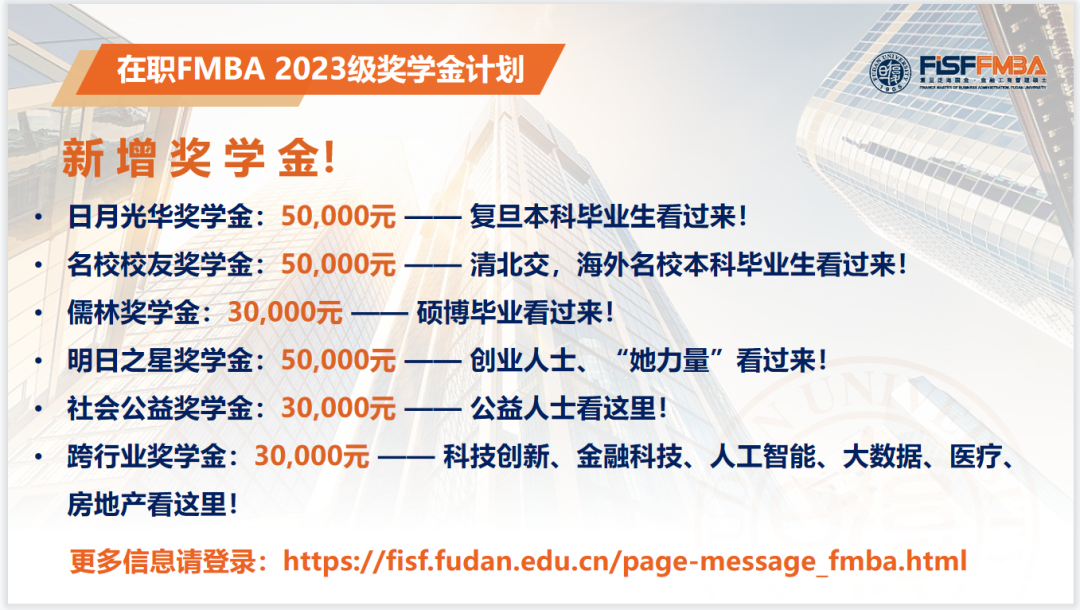 复旦大学泛海国际金融学院2023级各类新生奖学金可叠加,奖学金额度最高可达100%学费!全日制和在职均可享受,参考2023学费,在职金融MBA最高可获得52.8万奖学金。