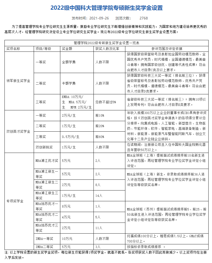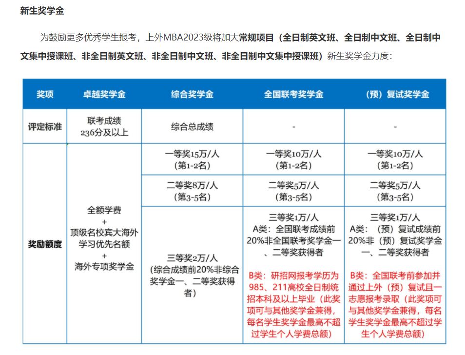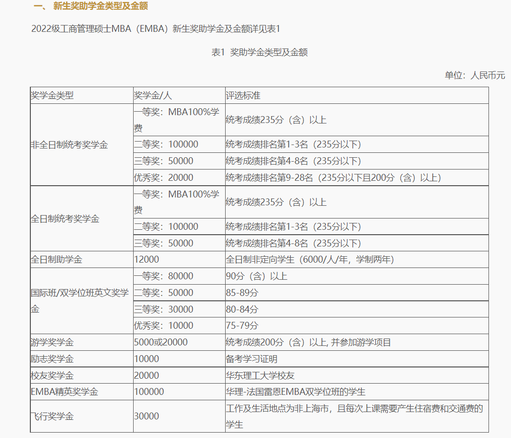 华东理工大学2022级奖学金政策中明确表示,非全日制/全日制统考成绩235分(含)以上,均可获得MBA100%学费的奖学金。