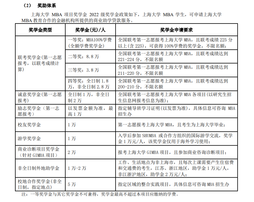 上海大学2022级奖学金政策中表示,以全国联考第一志愿报考上海大学MBA且联考成绩225分(含225),可获得100%学费的奖学金,不限名额。