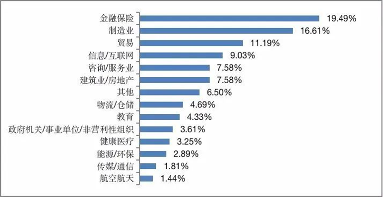 从中国海洋大学MBA新生入学数据来看,来自金融保险行业的人数最多,约占19.49%。