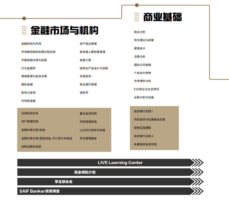 如图为交大高金在职金融MBA的课程设置,分为“金融必修课”、“必修选修课”和“金融选修课”,其中50多门金融选修课程覆盖金融各个领域的学习需求。包括一级市场的风险投资与私募基金,还有二级市场和交易工具等课程。