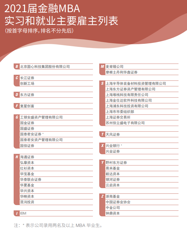 比如上海交大高金公布了2021届金融MBA学生实习和就业的主要雇主,其中就包括中金、国泰君安等头部金融公司。