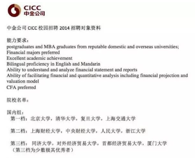 比如,网传中金Target School名册的国内第一档院校仅有清北复交,在招聘能力要求里还提到要有国内外知名院校的硕士或MBA学位。