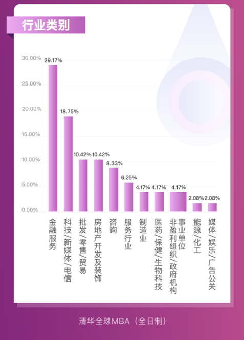 比如清华大学经济管理学院全球MBA(全日制)项目,29.17%新生来自于金融服务行业。