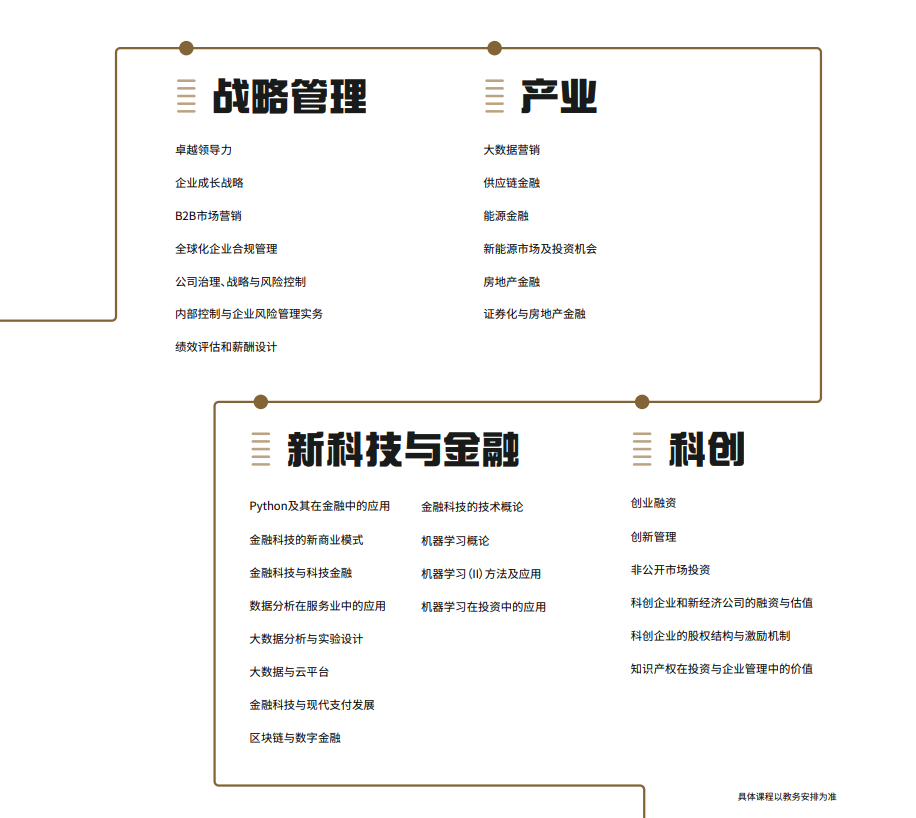 一般来说,在MBA选修课程中会包括金融相关课程。对从业者来说,如果想更深入地学习金融细分方向的知识,深化对金融行业的理解,可以选择金融特色MBA项目,让你站在宏观视角看待问题,也能补充晋升管理层所需的管理知识。
