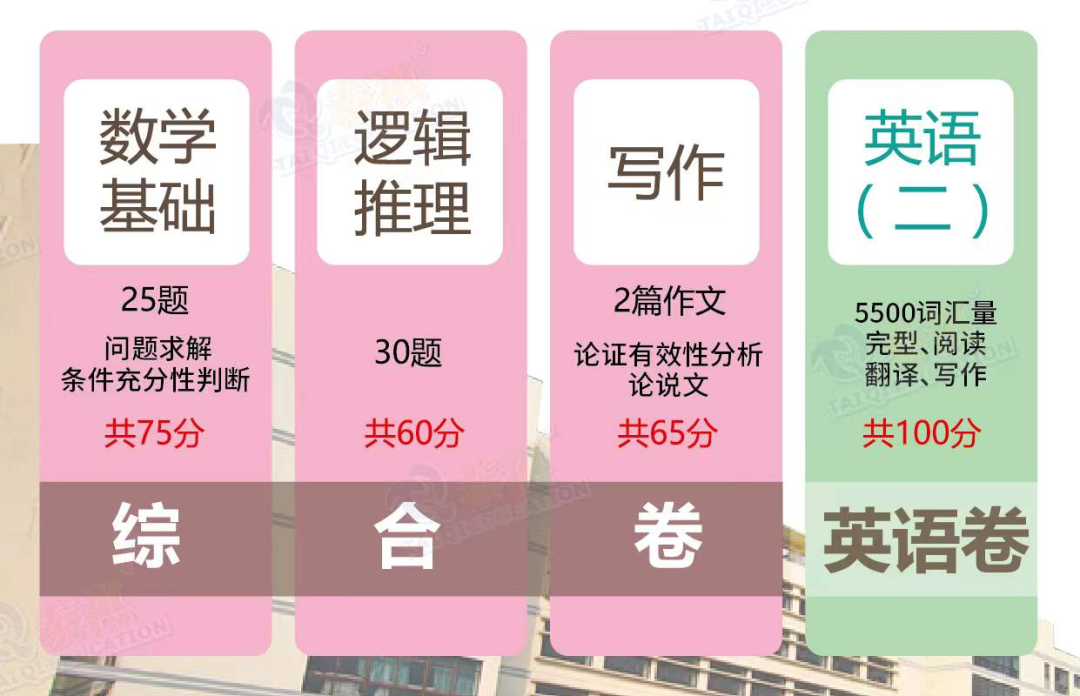 考四个科目,科目一是思想政治理论;科目二为英语一或日语(部分院校考俄语或者自命题小语种);科目三为学校自命题专业课(个别专业考数学三);科目四是学校自主命题的专业课。