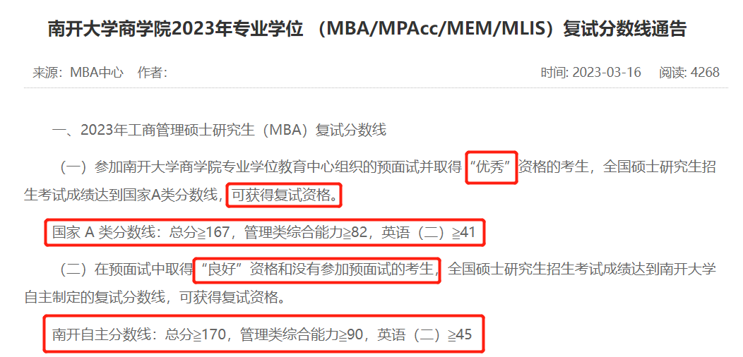 2.有提前面试:面试并取得“优秀”资格的考生,笔试只要达到国家A类分数线(23年国家A线167/82/41分),即可获得复试资格,通过复试可优先录取。