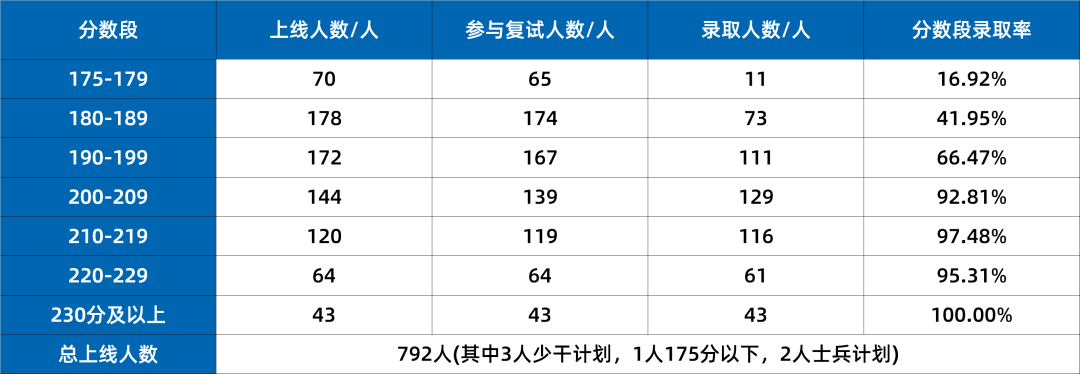 MBA因为其专业的特殊性,大多数的院校都会以国家线作为复试分数线,而既没有提前面试,复试分数线又高于国家线的院校肯定就会归为难考院校行列。再加上想要复试稳,只考到复试线还是远远不够的,比如四川大学没有提前面试,23年复试分数线为175/50/100,175-179分数段里进复试65人,才录取11人,要想稳妥些上岸,初试起码要200+分,录取率才能达到90+%,可见上岸难度!