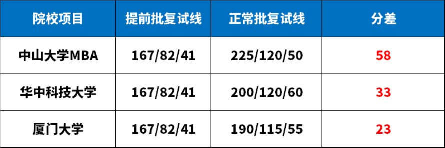 有些院校虽然没有提前面试,但初试分数线=国家线,考试难度也是不大的。如,东南大学MBA项目并不设置提前面试,2023年的复试分数线为国家线167/82/41,共有289人进入复试(288人正常批+1人士兵计划),最终有282人被录取,总录取率为97.5%,非常之高。