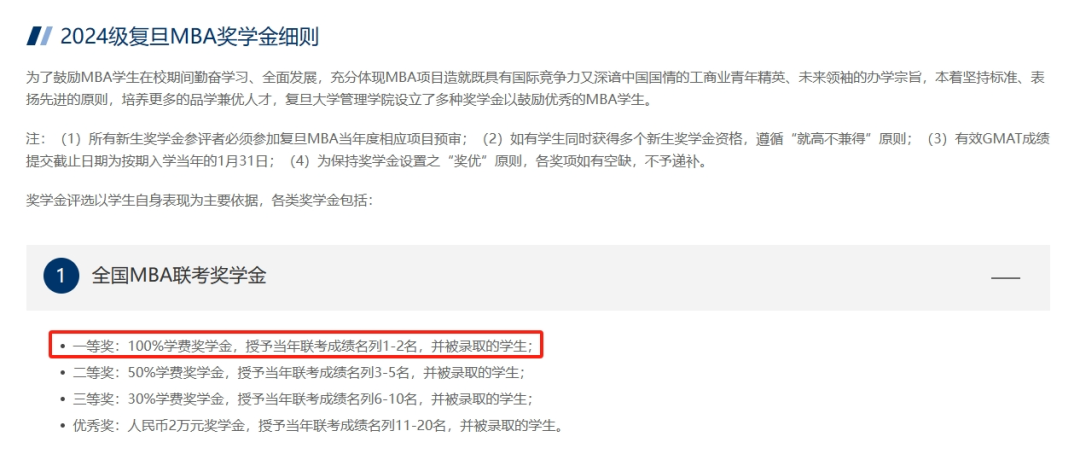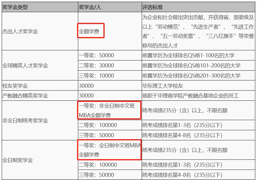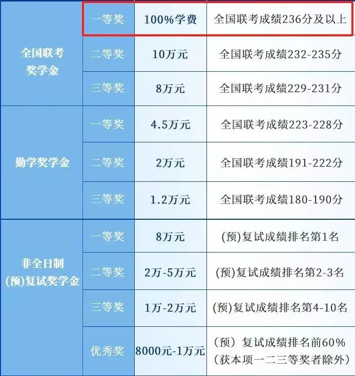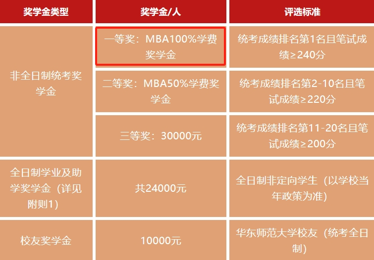 华东师范大学MBA2024级最高单项奖学金额度也可以100%覆盖学费,联考总成绩第一名,笔试成绩≥240分,非全日制都可获得100%学费的奖学金。