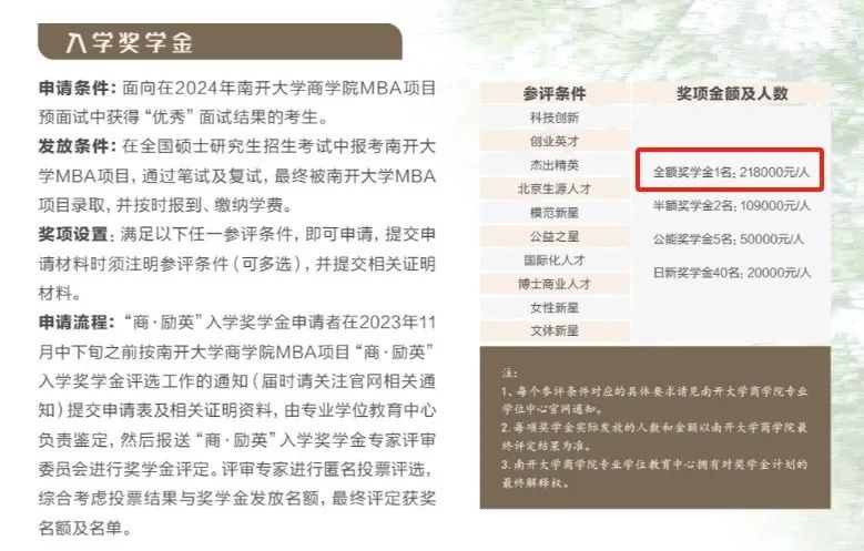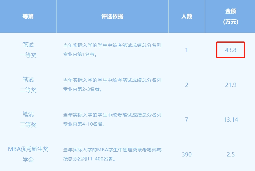 南开大学一共设立了10种奖学金,统一使用一个等级及金额分配规则,其中一等奖是21.8万,是南开MBA新年度的学费,也就是100%覆盖。