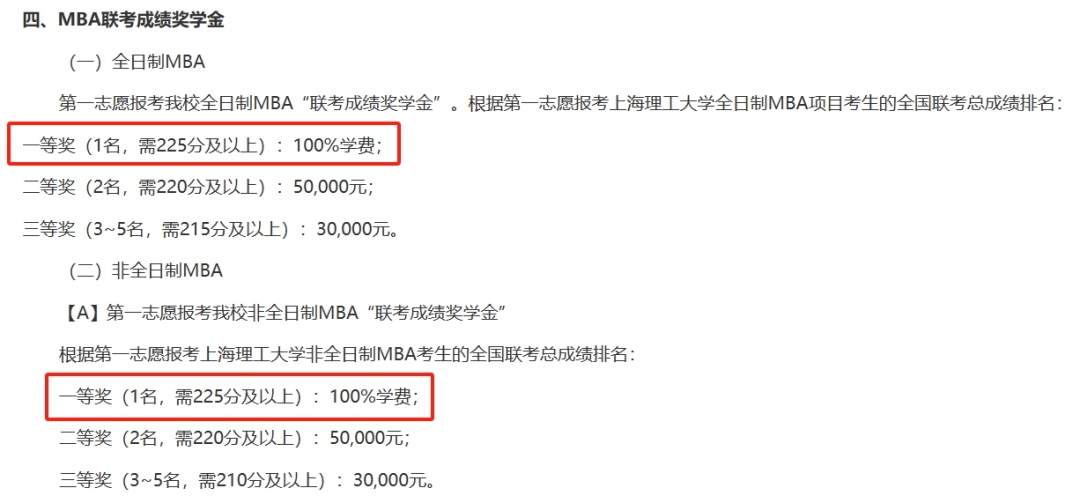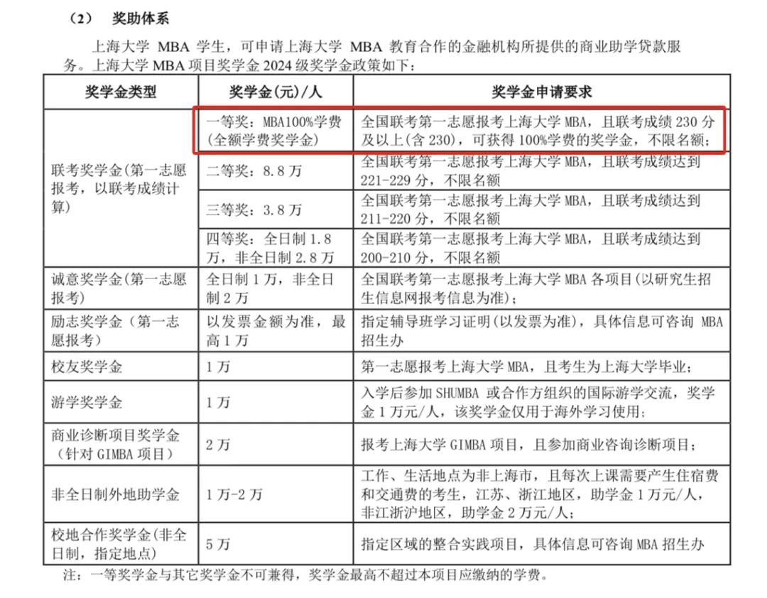 上海大学2024级最高单项奖学金额度也可以100%覆盖学费,只要是以全国联考第一志愿报考上海大学MBA且联考成绩230分(含230),可获得100%学费的奖学金,不限名额。