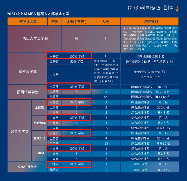 其次,报考MBA的同学,统考成绩排名第一/预面试成绩排名第一/综合成绩排名第一/GMAT成绩排名第一,满足其中任意一项即可获得100%学费的奖学金;报考EMBA的同学综合成绩排名第一,也可获得100%学费的奖学金。