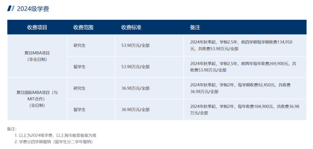 MBA院校的学费大多数根据学制分两到三次缴纳,而非一次性缴纳。