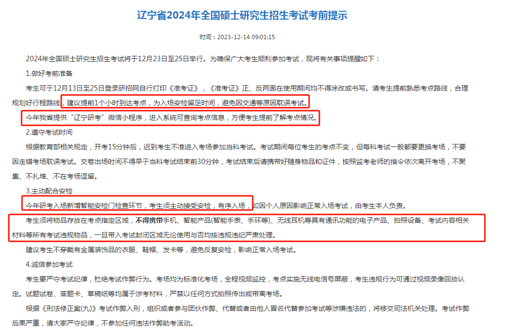 由于安检步骤增加,不少考点明确规定,要求考生提前1小时到达考点,留足入场检查时间。
