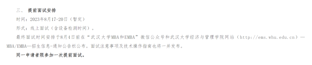 部分院校非全日制MBA提前面试批次减少,比如武汉大学23年提面批次从2次减少到只有1次;中国人民大学非全MBA提前面试批次也减少了。