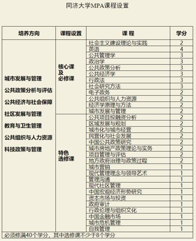 以同济大学MPA课程设置为例,无论核心课及必修课还是特色选修课,都涵盖了公共管理与政策研究的理论基础和分析方法及技巧,针对性和实用性很强。