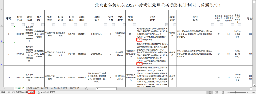 MPA毕业生能报的岗位也不在少数,以北京市各级机关2022年度考试录用公务员职位计划表(普通职位)为例,粗略筛选出公共管理【1252】岗位157个,可报考岗位占总招考岗位7.13%,这个数据还不包括那些不限制专业的职位。