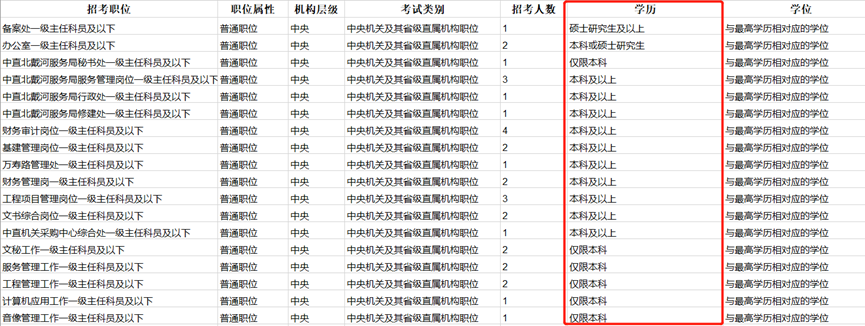 从历年公务员的报考条件来看,许多岗位都没有设置很高的学历门槛,本科生即可报考。如下图,2020年国考职位信息表中,许多中央党群机关的职位要求为“本科及以上”或“仅限本科”,可见本科生可选择的余地还是很大的。