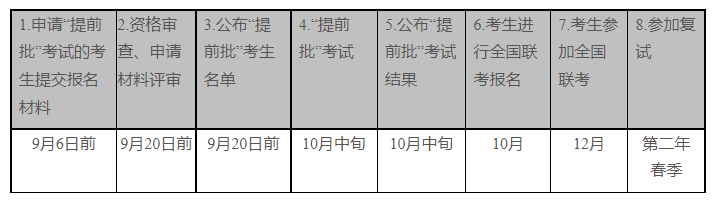 符合报考条件的考生可申请参加“提前批”考试(不接受报考专项计划的考生申请)。“提前批”考试将安排在全国联考之前,考试成绩仅在该招生年度有效,考试方式为面试+笔试。