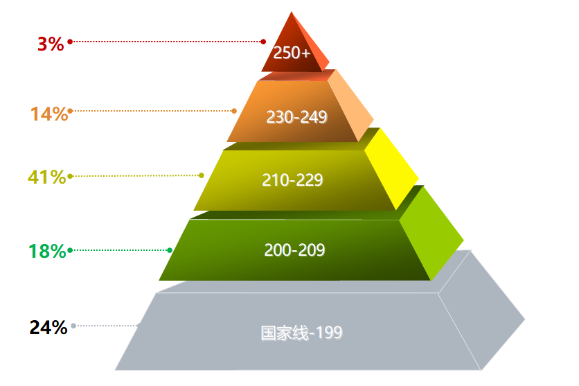 由上图可以看出,超高难度院校(230分以上)占比仅有17%,低难度院校(低于200分)竟占比24%之多。同学们可以根据自己的基础及复习成果量力而选。