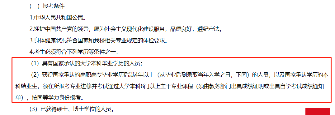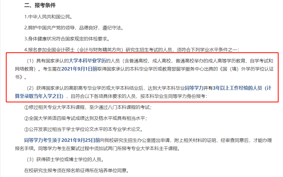 (1)具有国家承认的大学本科毕业学历的人员(含普通高校、成人高校、普通高校举办的成人高等学历教育、自学考试和网络教育)。考生需在2021年9月1日前取得国家承认的本科毕业学历或教育部留学服务中心出具的《国(境)外学历学位认证书》。