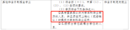 ②获得国家承认的高职高专毕业学历后满4年以上(从毕业后到录取当年入学之日,下同)的人员,以及国家承认学历的本科结业生,须在所报考专业进修并考试通过大学本科8门以上主干专业课程(须由教务部门出具成绩证明或出具自学考试成绩通知单),按同等学力身份报考。