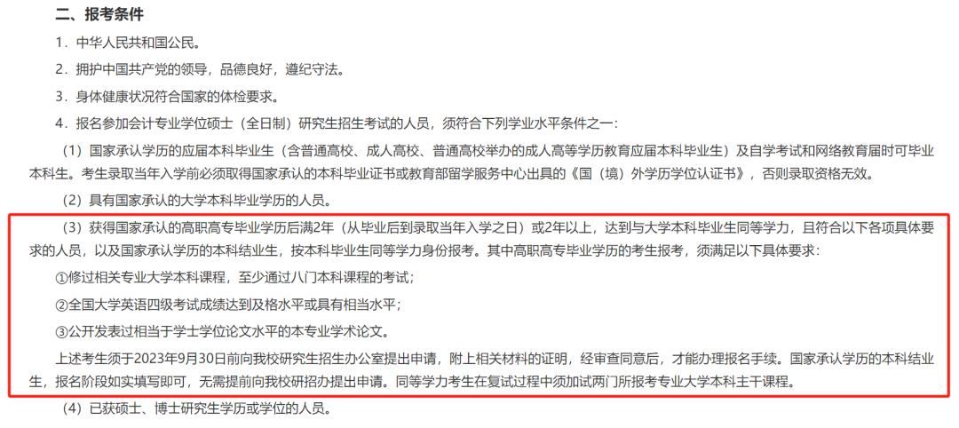 3. 获得国家承认的高职高专毕业学历后满2年(毕业后到录取当年入学前,下同)或2年以上的人员,以及国家承认学历的本科结业生,符合招生单位根据本单位的培养目标对考生提出的具体学业要求的,按本科毕业同等学力身份报考;