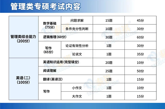 初试考199管理类综合能力(简称管综)和英语(二)两科。具体题目类型及分值如下表: