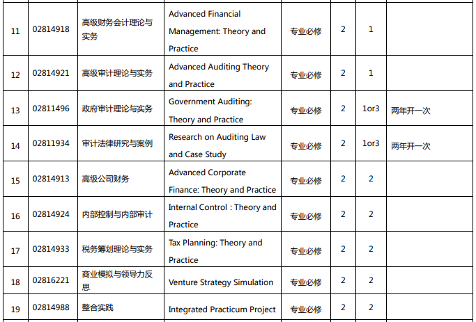 价值引领与职业规划、高级微观经济学、宏观经济管理、金融计量经济学、投资学、商业伦理与职业道德、高级财务会计理论与实务、高级审计理论与实务、政府审计理论与实务、审计法律研究与案例、高级公司财务、内部控制与内部审计、税务筹划理论与实务、商业模拟与领导力、整合实践等。