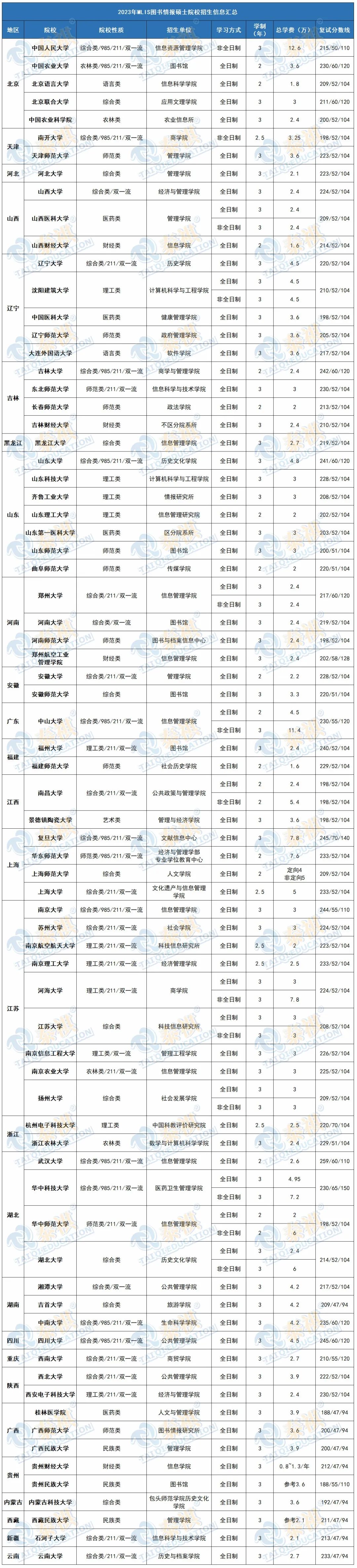 截止到2023年,全国共有74所院校招收图书情报硕士,今天我们就汇总了这些院校的学制学费、复试分数线等信息,供同学们进行择校参考。
