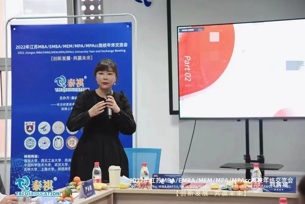 为了促进江苏高校之间的交流分享,共同提升教育品质,创新发展,共赢未来,泰祺教育特邀多位高校代表,于12月17日在泰祺江苏分校召开了2022年江苏MBA、EMBA、MEM、MPA、MPAcc院校年终交流会,各大高校的管理类硕士项目主管领导及相关老师莅临现场,共享这场盛大的教育盛宴!