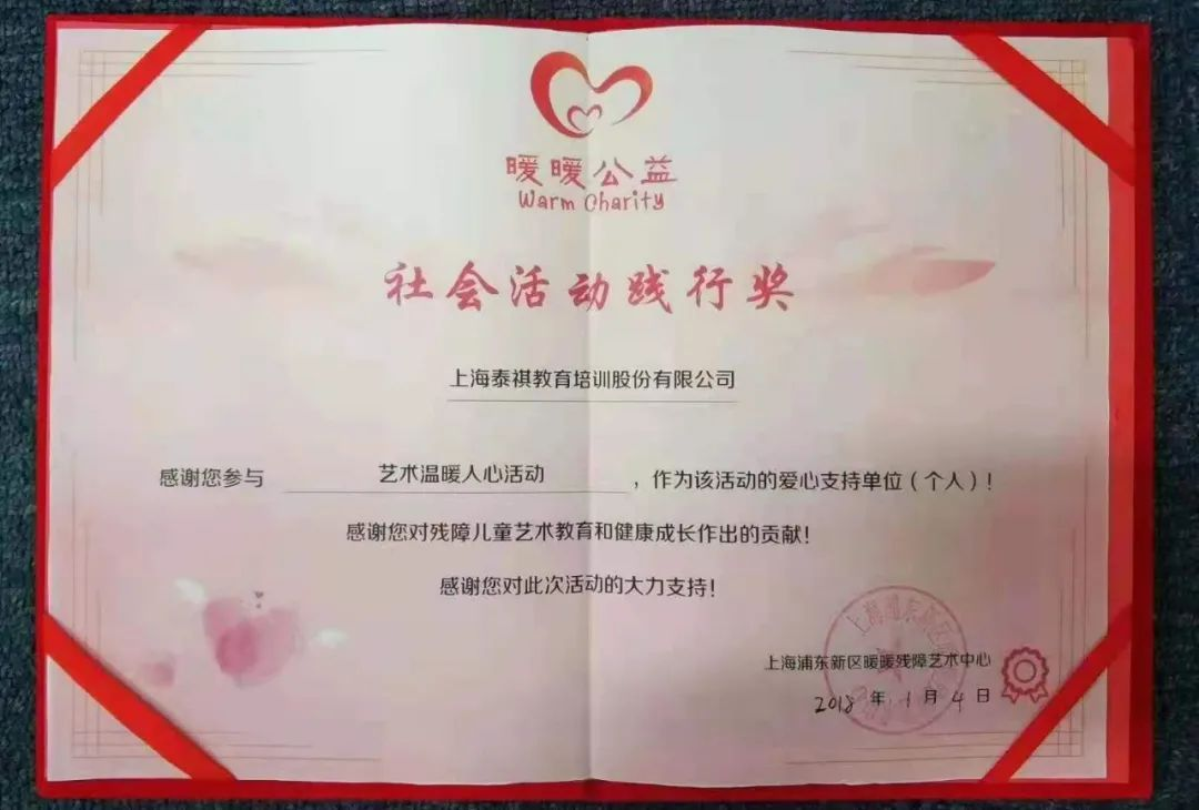2018年,泰祺教育获得上海暖暖公益颁发的“社会活动践行奖”