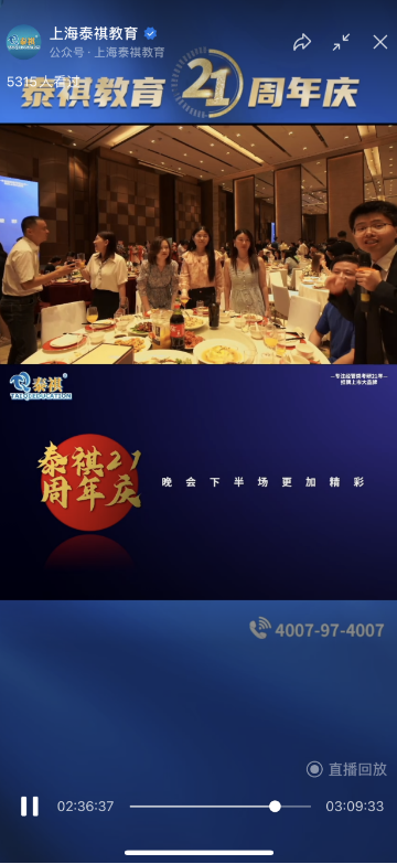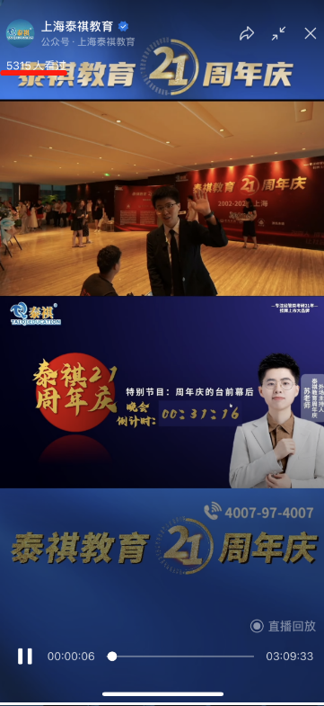 为让未能到现场的校友共襄喜悦,本次21周年庆典采取线下线上相结合方式举行,线上同步直播,场外直播由泰祺教育语文写作教研组组长苏老师主持。苏老师带线上的校友学员“云探”盛典,探访泰祺21周年台前幕后。本次周年庆直播共计5000余人观看,感谢大家对泰祺的关注。