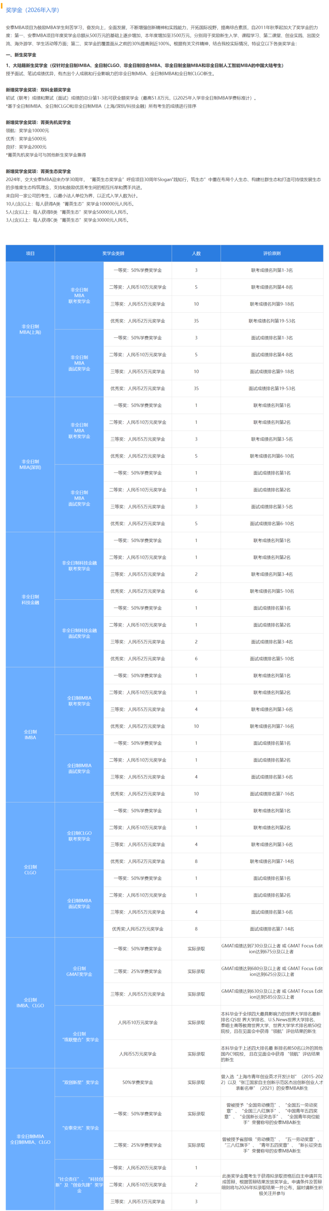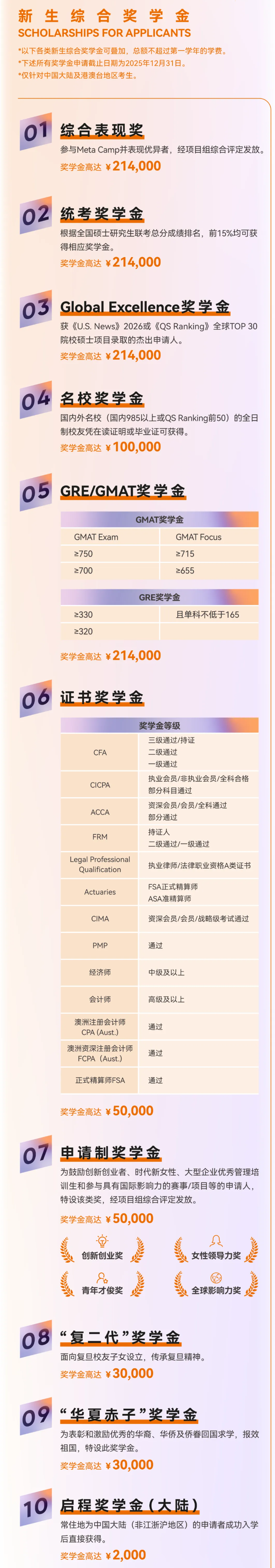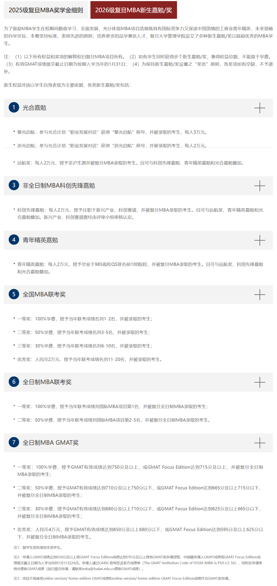 复旦管院2026级MBA设置丰富的新生嘉勉/奖,单项最高100%学费,并且如果满足多项条件,可以兼得权益总额,不能高于学费。