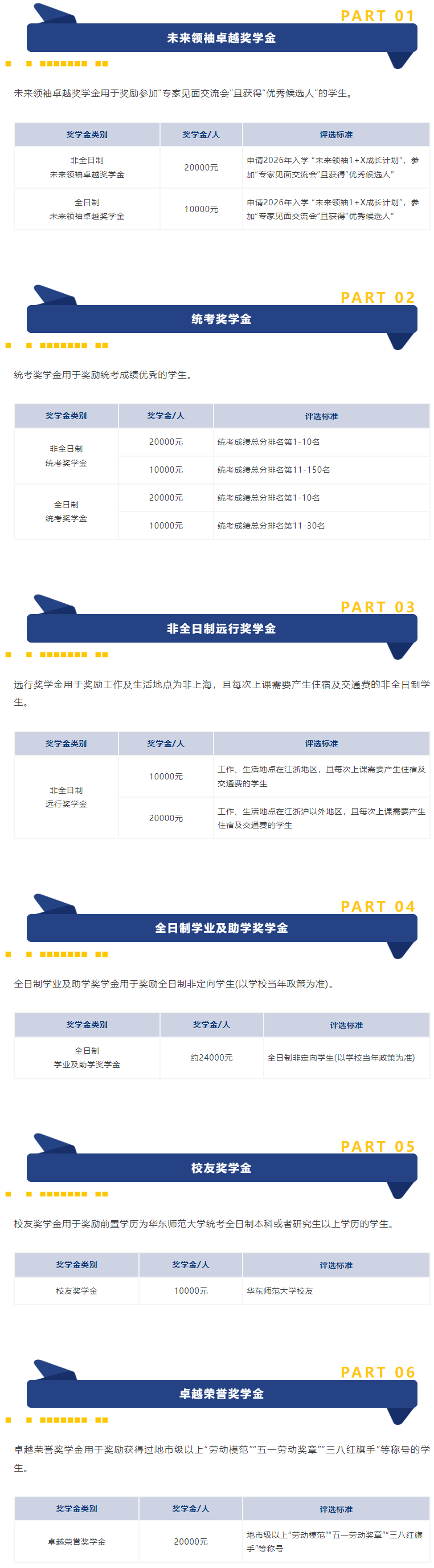 华东师范大学2026级MBA设置领袖卓越奖学金、统考奖学金、非全日制远航奖学金、校友奖学金、卓越荣誉奖学金等多项新生奖学金,并且可以叠加享受。