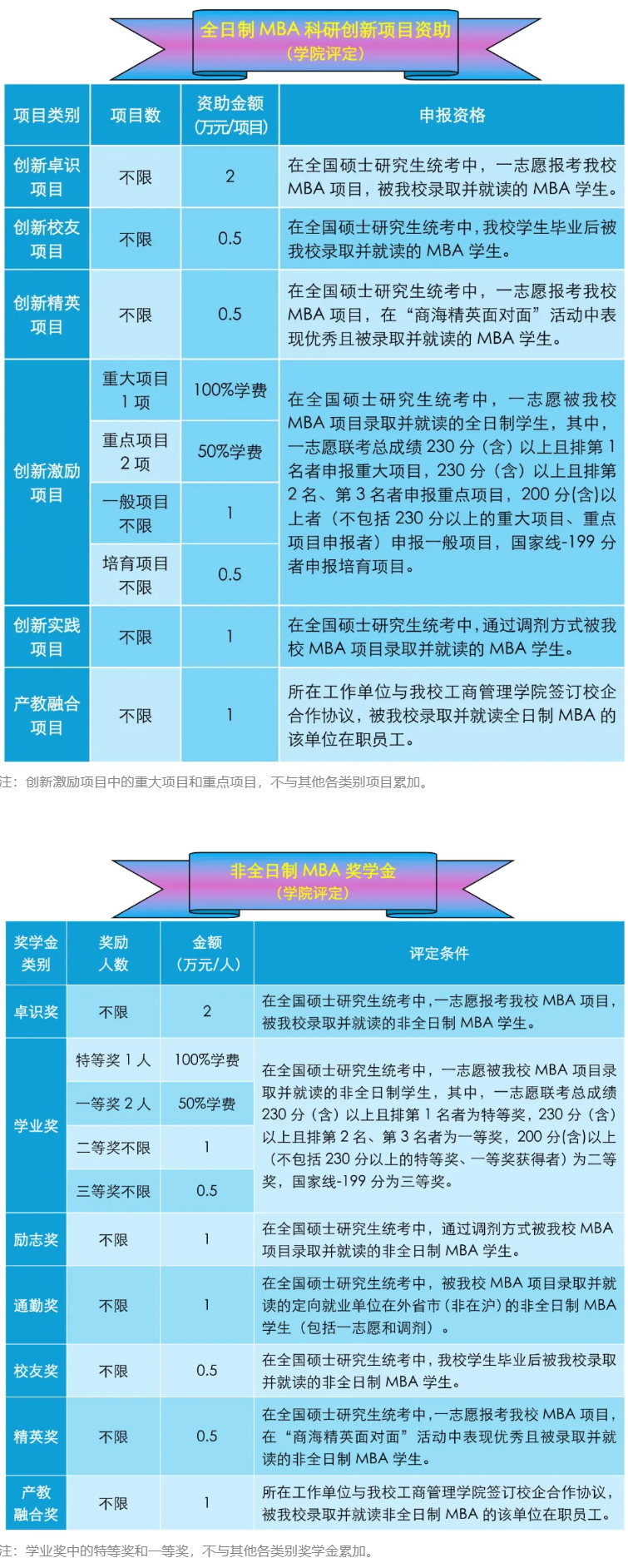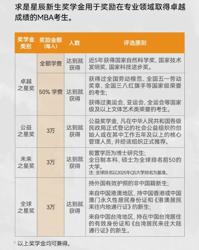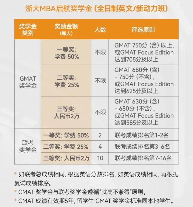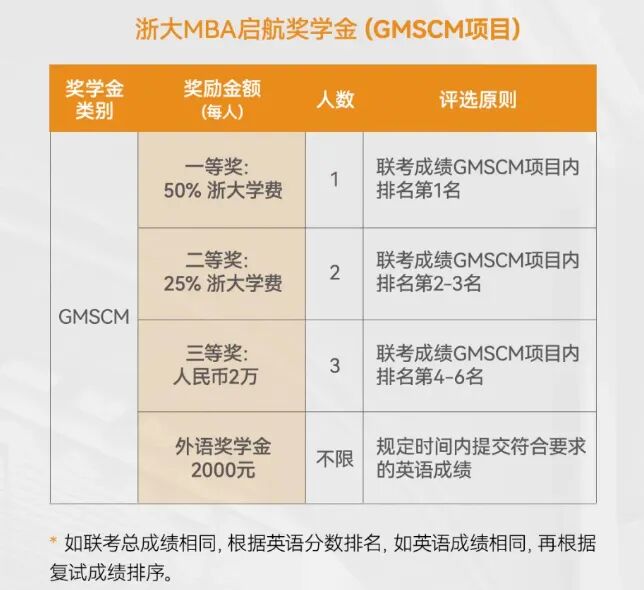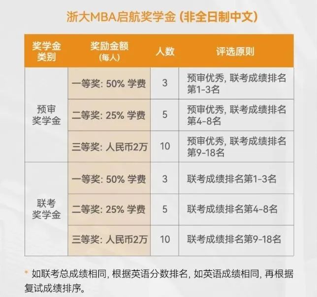 初试(联考)成绩和复试(面试)成绩的总分第1-3名可获全额奖学金(最高51.8万元,以2025年入学非全日制MBA学费标准计)。