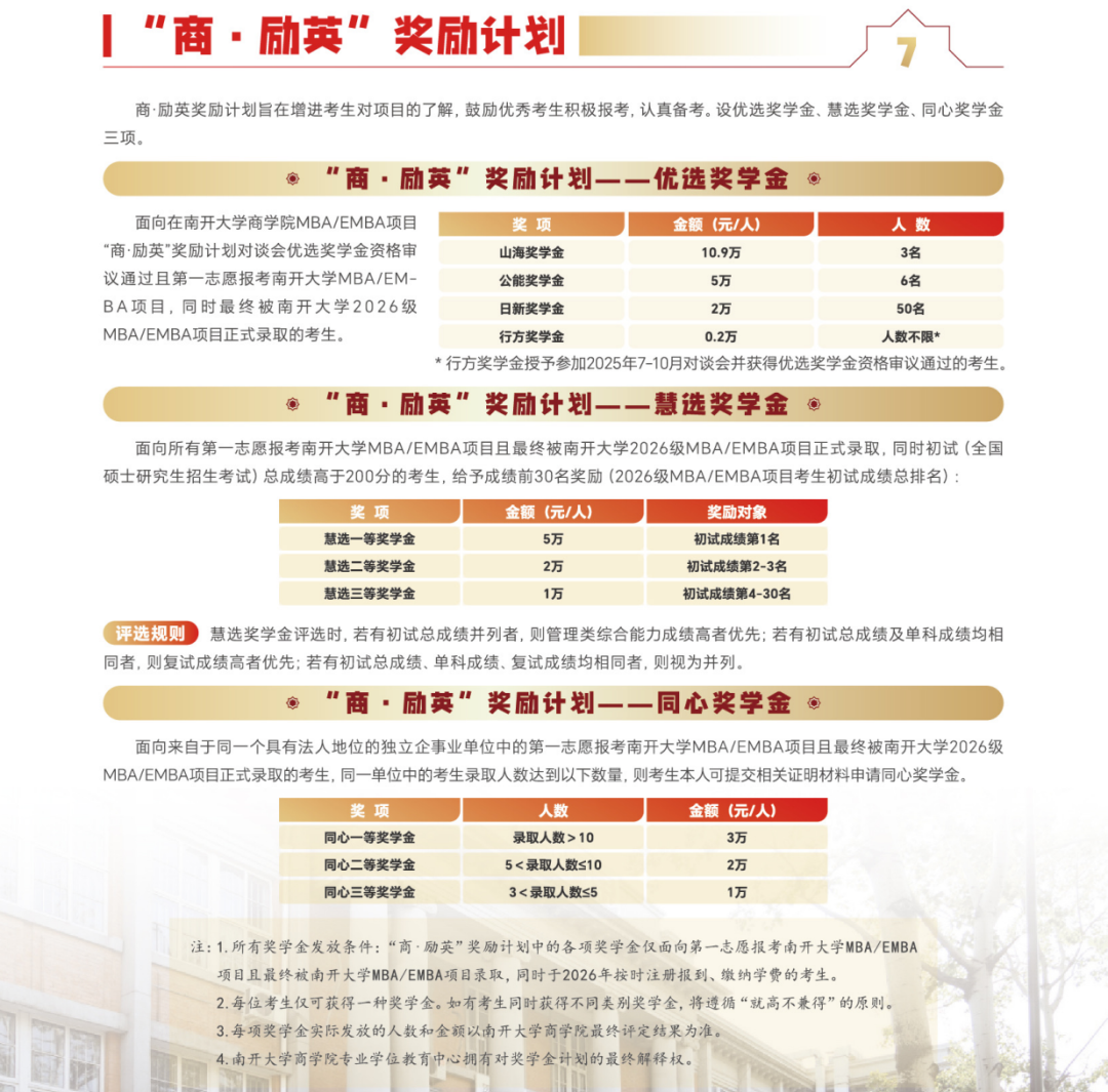 南开大学2026级MBA设置优选奖学金、慧选奖学金、同心奖学金三项,每位考生可以获得其中一项,就高不兼得。