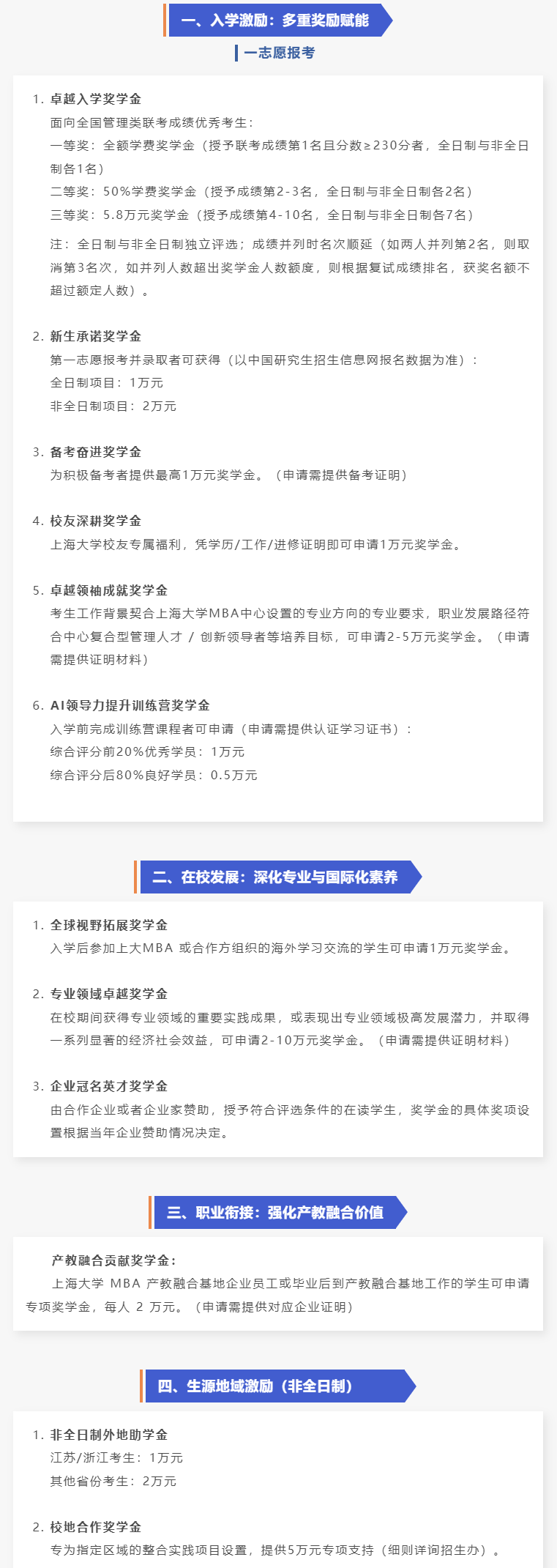 上海大学2026级MBA设置千万级奖学金,只要一志愿录取就能拿到1到2万元奖学金,覆盖率100%。