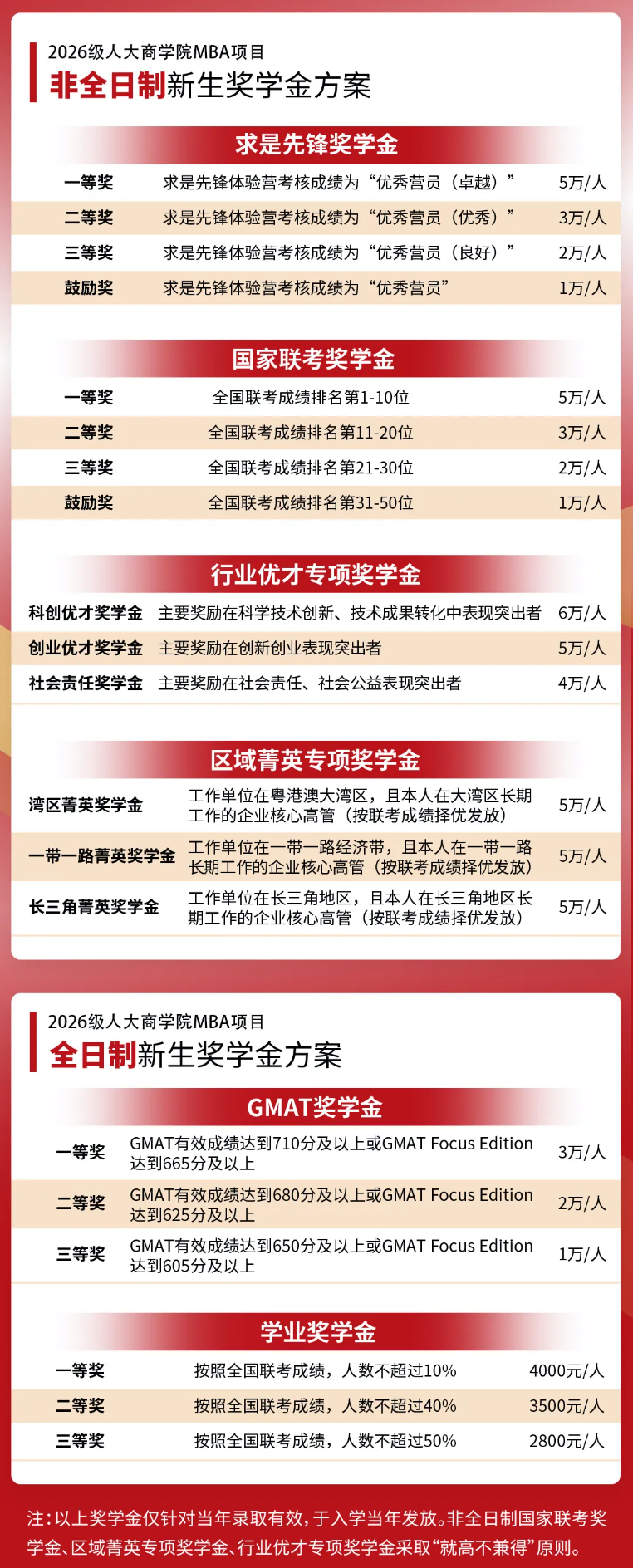 中国人民大学2026级MBA奖学金单项最高5万元,分为体验营奖学金、联考奖学金、行业优才奖学金等多项奖励。