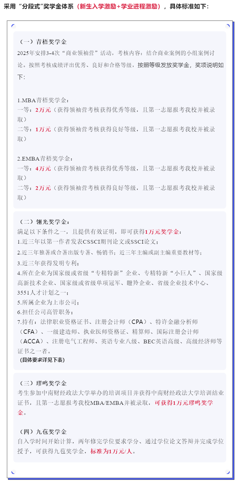 中南财经政法大学针对2026级MBA新生设置青梧奖学金、翎光奖学金、璆鸣奖学金,单项额度1万到4万元不等。除了新生入学奖学金外,各个学校还可能针对在读学生会设置各类竞赛奖学金、毕业奖学金等等多项奖学金。