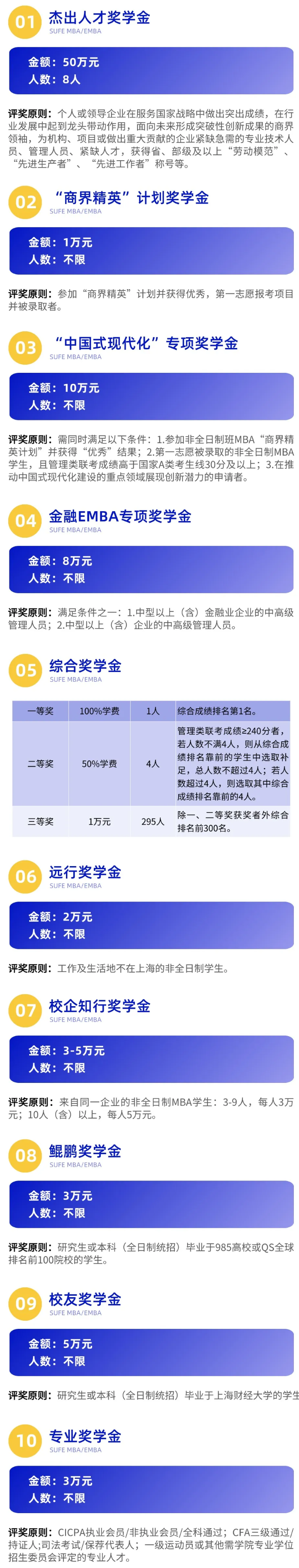 上海财经大学2026级MBA新生奖学金单项最高50万元,并且设置8名之多,其他各类奖学金也非常丰富。