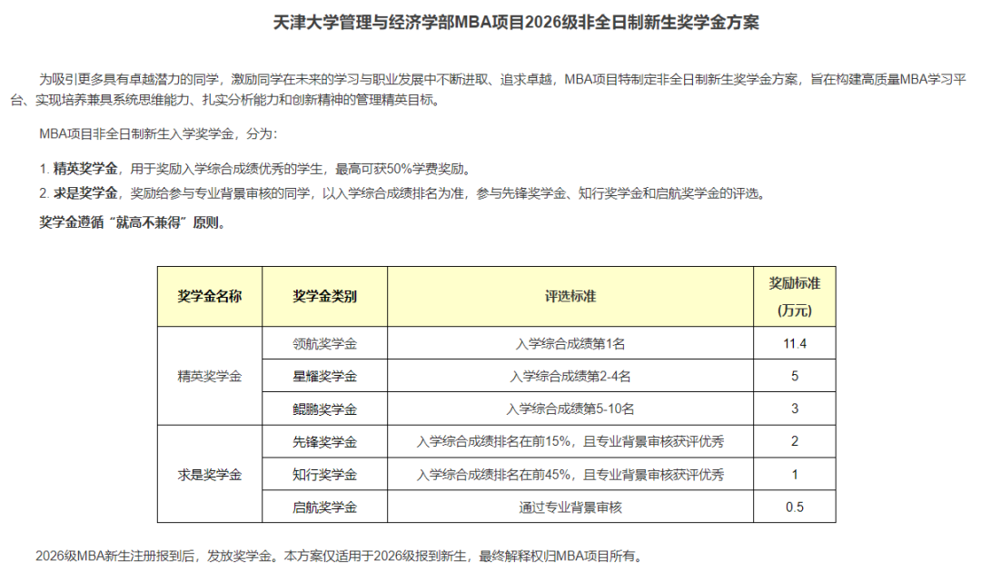 天津大学2026级MBA设置精英奖学金和求是奖学金,用于奖励综合成绩靠前,和专业背景突出的新生。