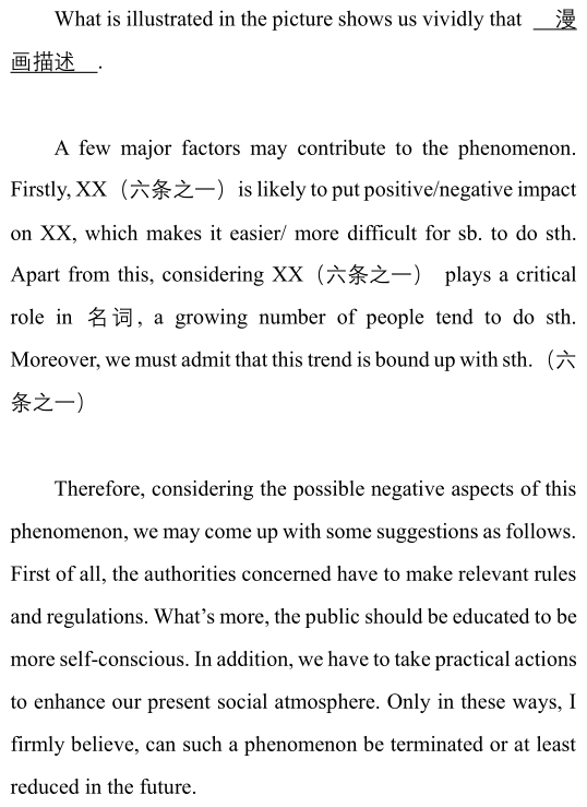 一些同学觉得,自己好不容易才把图表作文模板背下来,怎么又要背漫画作文模板了呢?其实,漫画作文跟图表作文的模板有共通之处,只是在第一、三段改动一些,尤其是第三段提供解决方案的句子,因为漫画都是含有寓意或者反讽的情况。