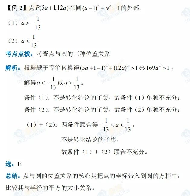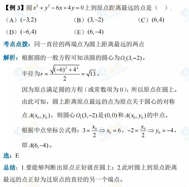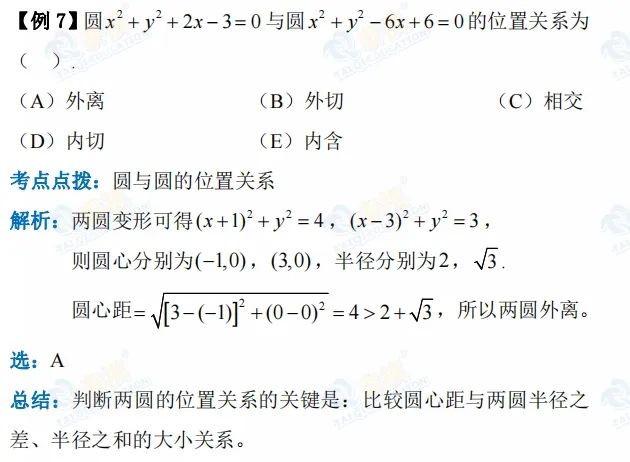 在管综数学考试中,解析几何的知识点就是从点、线、圆三方面展开。比如:两点、点线、点圆、线线、线圆、圆圆之间的关系,大家将这几种关系弄清楚,理明白,那么就可以轻松解决解析几何的相关题目了!接下来我们逐一分析: