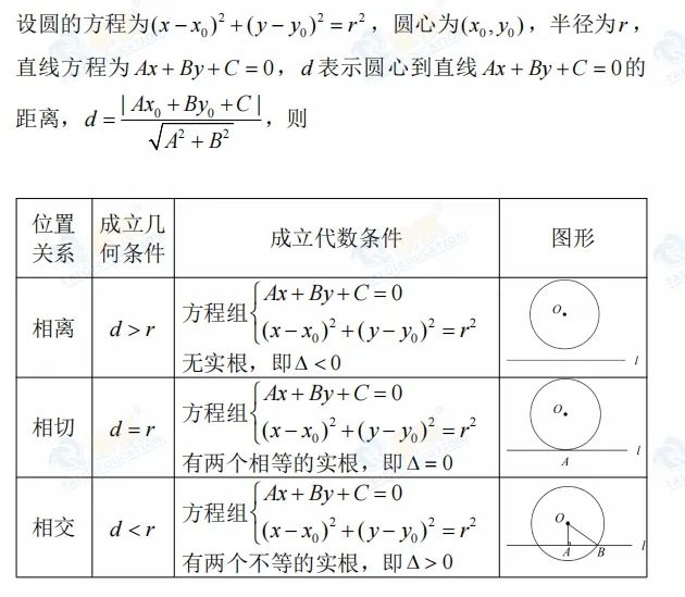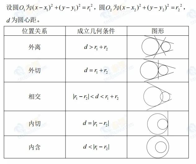 对于两点距离,需熟记两点距离公式;对于点线距离,需熟记点线距离公式;对于直线与直线的三种位置关系,可结合图形记忆对应的“满足条件”;对于点和圆、线和圆、圆和圆的位置关系,可根据每种情况的图形来记忆其“成立几何条件”,根据其成立条件来解答。