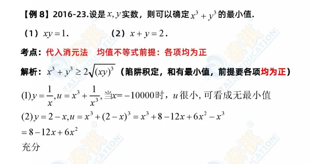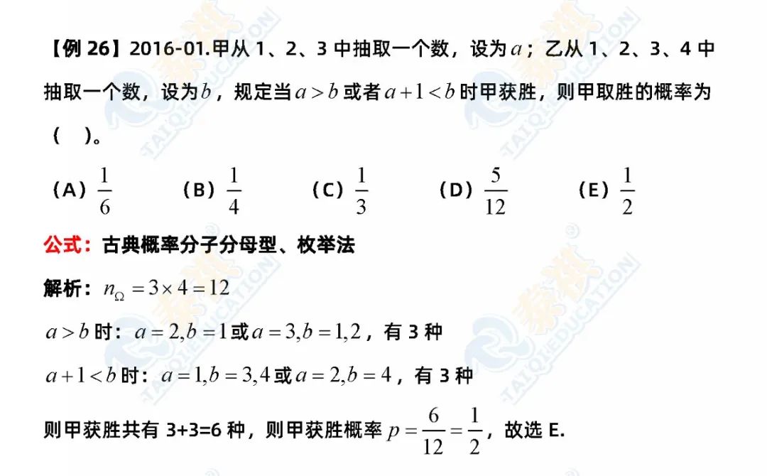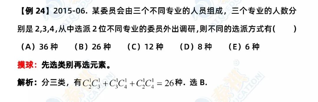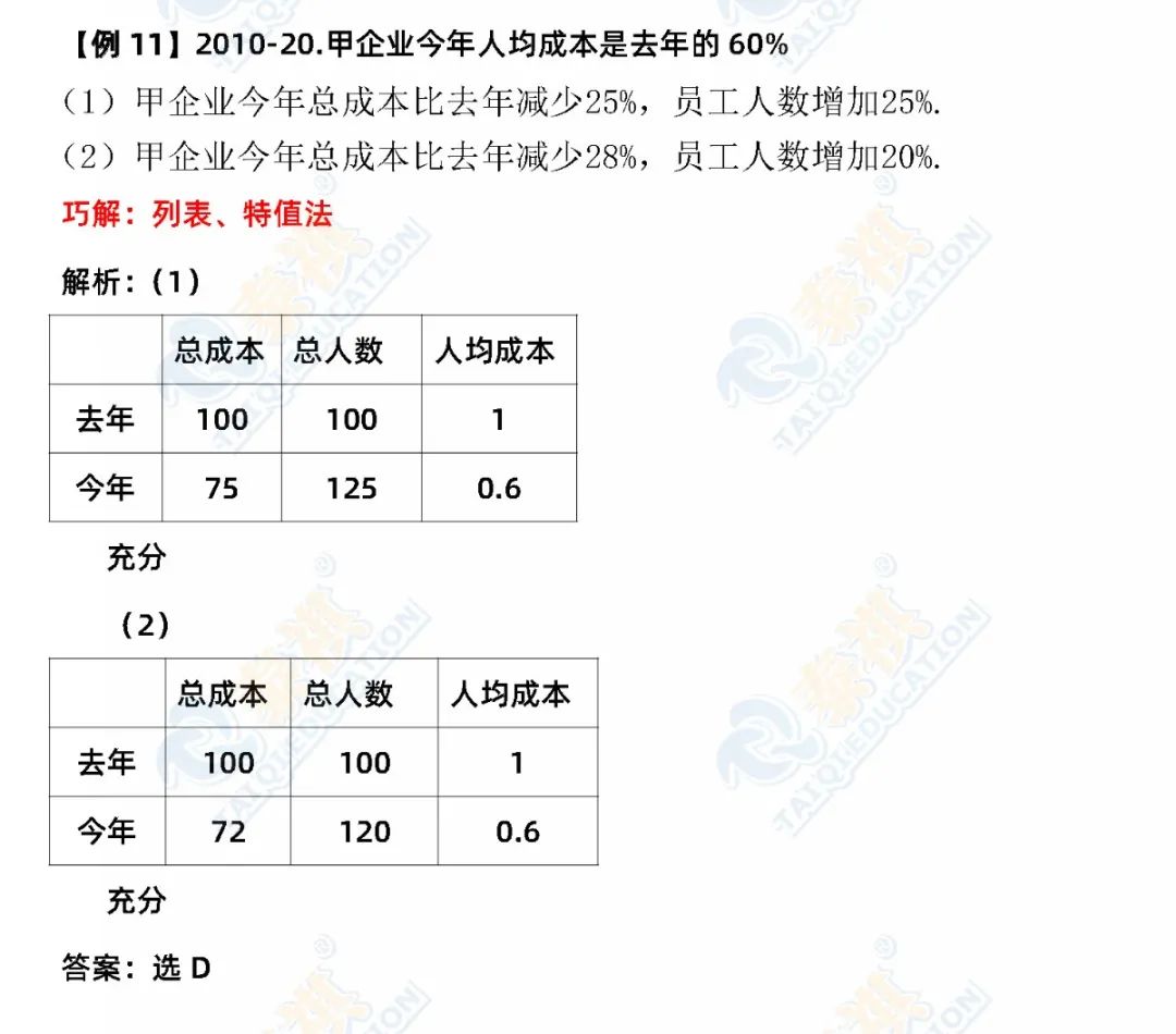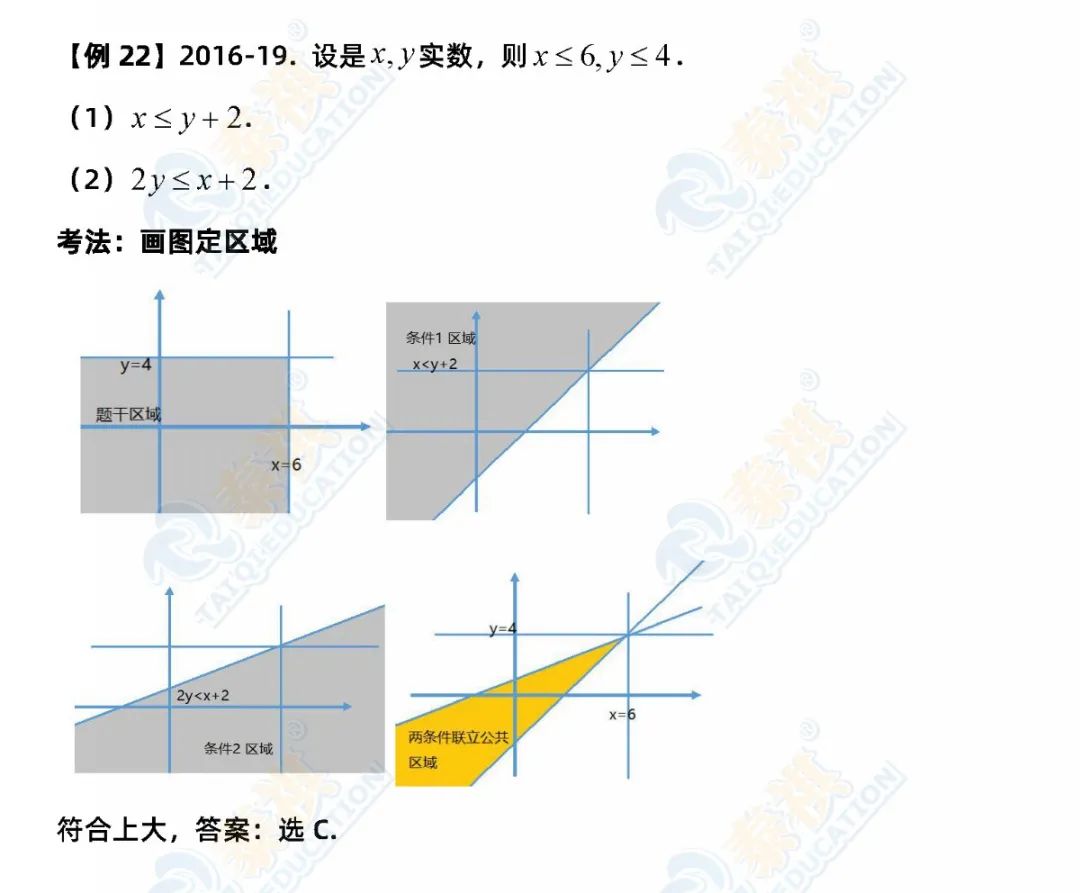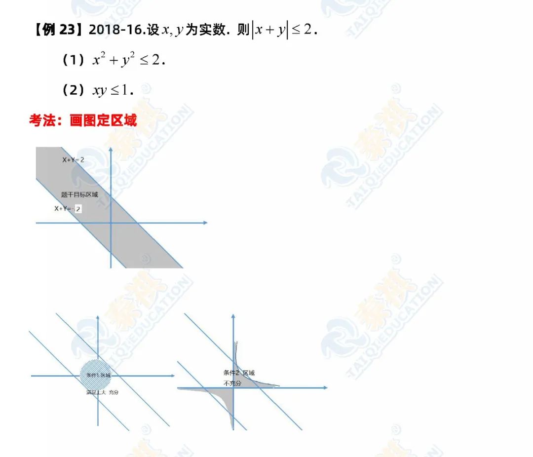 ③再总结一下选择题解题的特殊方法。数学选择题是知识的灵活运用,解题要求是只要结果、不要过程。因此,代入、排除法、特值法、枚举法、数形结合法、估算法尽显威力。有技巧的题,若能把握得好,一分钟一题,难题也不超过两分钟。条件充分性判断中“确定”型的题型认真分析研究控制量;比较大小多找不正确的例子;复杂的就先公式化简再验证。