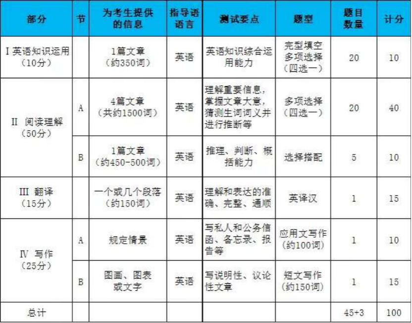 试题分四部分,共48题,包括英语知识运用、阅读理解、翻译和写作。