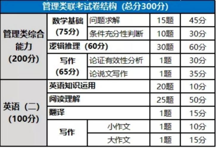 管理类综合能力考试(包括数学基础、逻辑推理与写作)、英语(二)。总分300分,英语(二)独占三分之一,分值100分,而且管理类联考分数线有英语单科线。也就是说英语不过线,综合考满分,你依然与理想院校无缘...